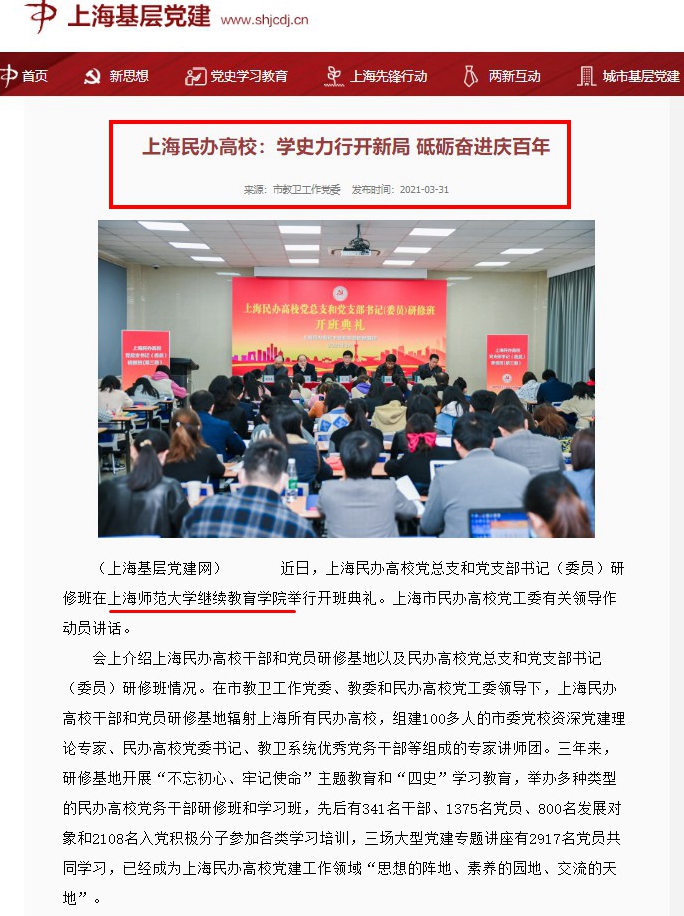 3月31日,上海基层党建网以“头条新闻”形式,专题报道304永利集团官网入口为上海民办高校举办第三期党总支和党支部书记(委员)研修班,开展党史学习教育。