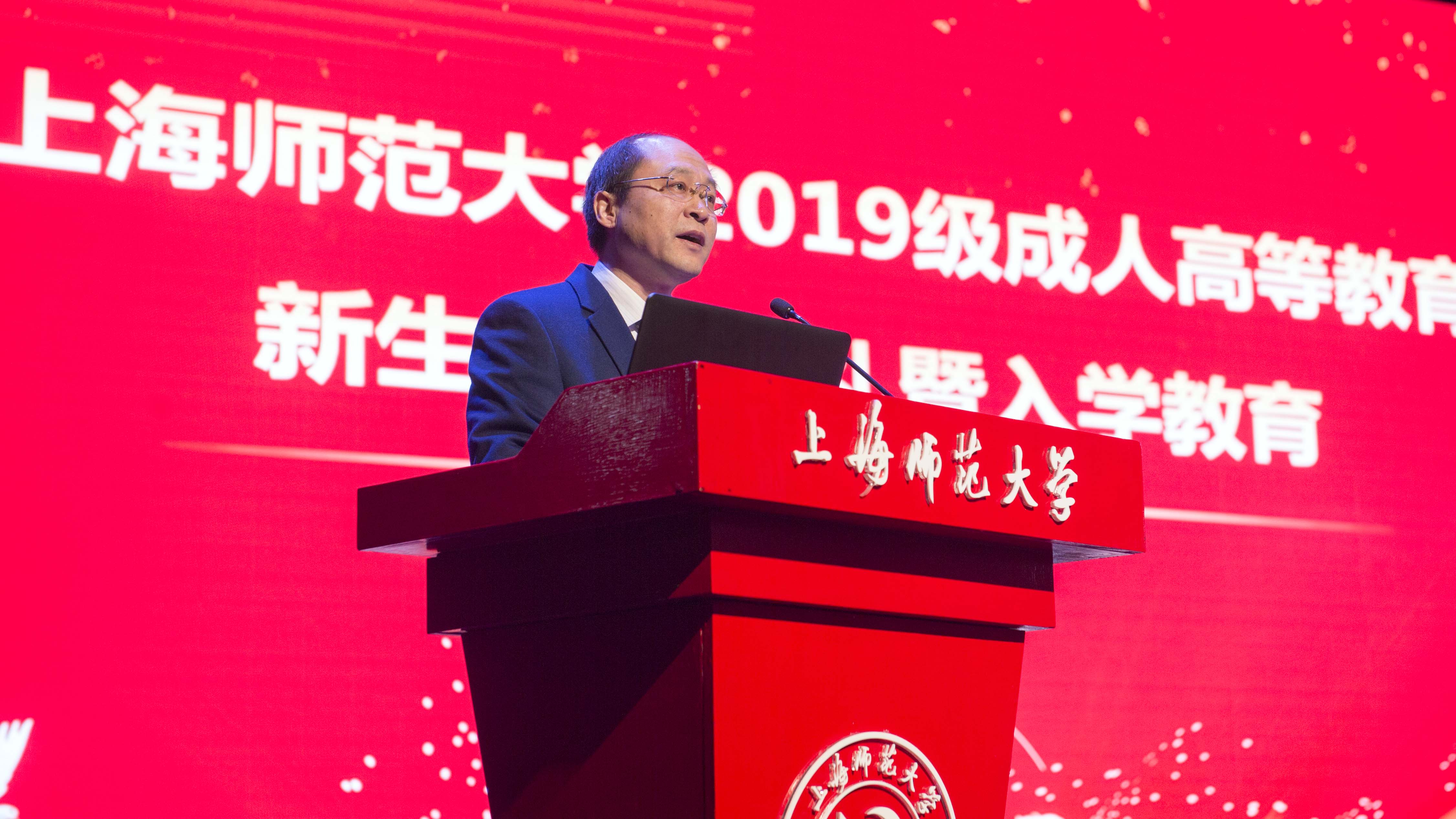 康校长代表学校对全体新生表示热烈欢迎,并感谢他们选择上海师大。他从国家发展、学校育人结合学生成才角度出发,殷切寄语新同学:一、要坚持做敢于梦想的师大人。他勉励新生要紧抓历史机遇,紧扣发展脉搏,将本职工作与学习充电有机结合,为实现更高的人生价值做足知识和能力储备。二、要敢于做努力拼搏的师大人。他要求新生努力克服工作、学业、家庭上的矛盾和困难,统筹安排时间和节奏,善于用碎片化的时间进行系统学习,奋发有为,完成学业。三、要立志做热爱生活的师大人。成教新生难免要同时面对现实“焦虑”、职场“困扰”和学习“压力”,但要能立足长远,放眼大局,热爱生活,心怀感恩,常用同理心换角度去思考问题,要多一些理解与包容,多一些善意与关怀,多一些温暖与阳光。康校长要求同学们不仅要工作和学习过硬,还要立志成为身心健康、志趣高雅的人。他指出,身处技术革新及社会剧变的新时代,唯有不断地更新知识保持应变力,方能使个人的发展跟得上时代的进步。