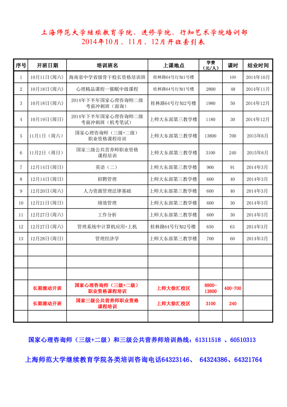 304永利集团官网入口培训部2014年10月、11月、12月开班索引