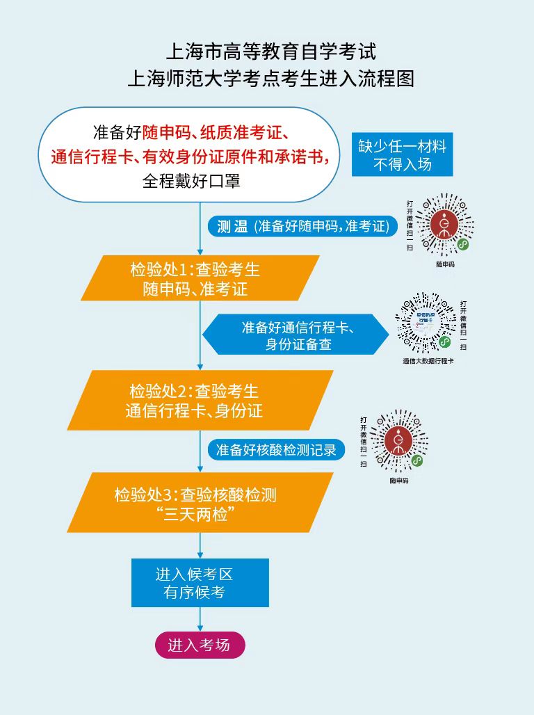 进入考点时,考生须接受防疫安全检查和指导,凭有效身份证件原件、纸质准考证、填写完整并签名的纸质版《承诺书》(每场考试一张)、上海“随申码”(绿码)、“通信大数据行程卡”,经体温检测及查验通过后方可进入考点。
