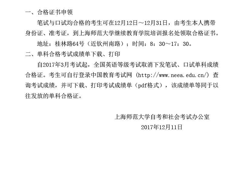 2017年下半年全国英语等级考试(PETS)合格证领取通知