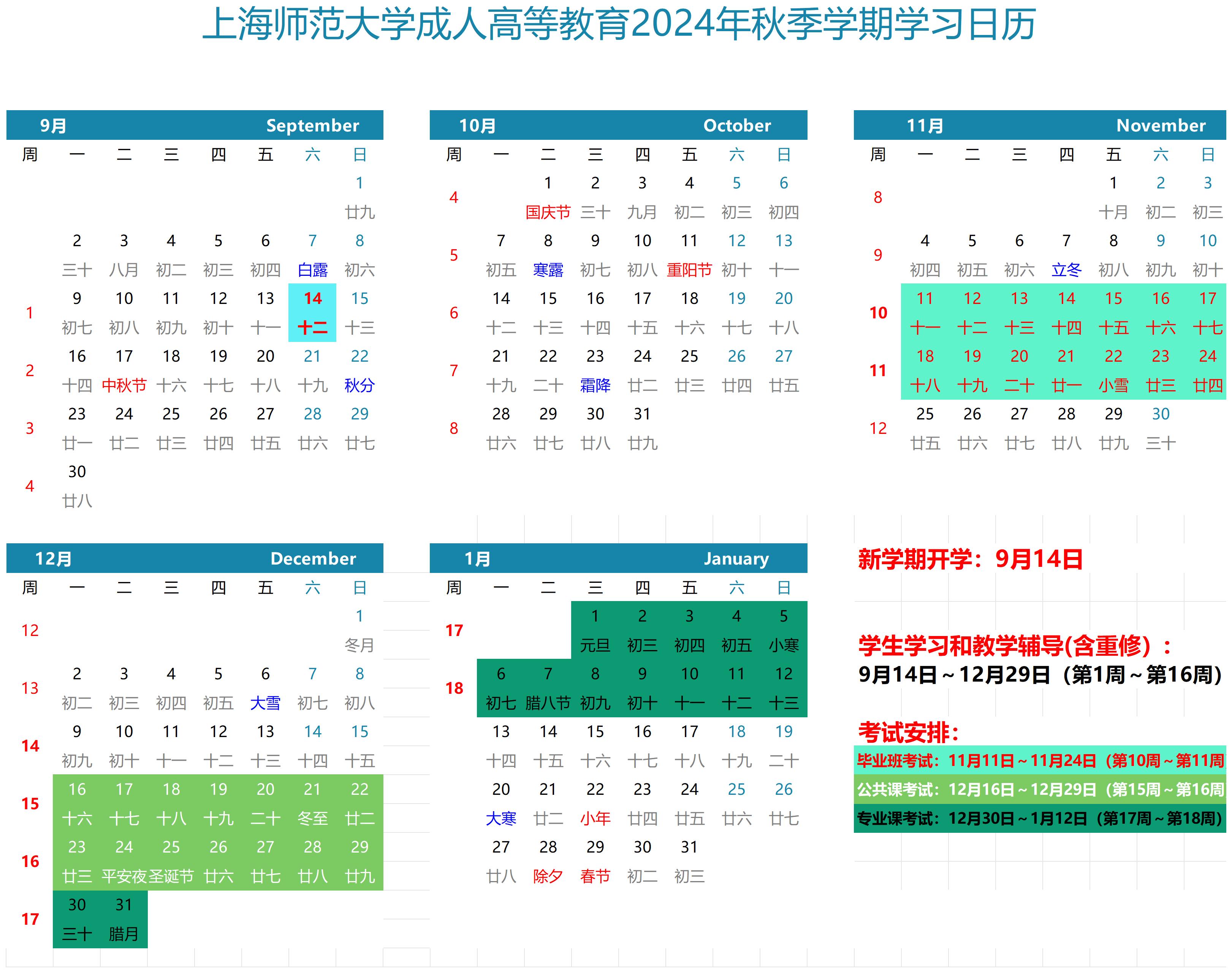 学生学习和教学辅导(含重修):9月14日~12月29日(第1周~第16周)