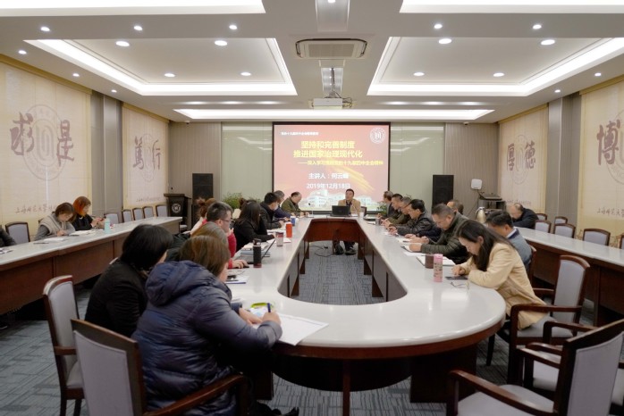 1218日下午,认真学习宣传贯彻落实党的十九届四中全会精神,304永利集团官网入口邀请学校宣讲团成员何云峰教授以“坚持和完善中国特色社会主义制度、推进国家治理现代化”为题,在学院301会议室为全体教职工宣讲党的十九届四中全会精神。