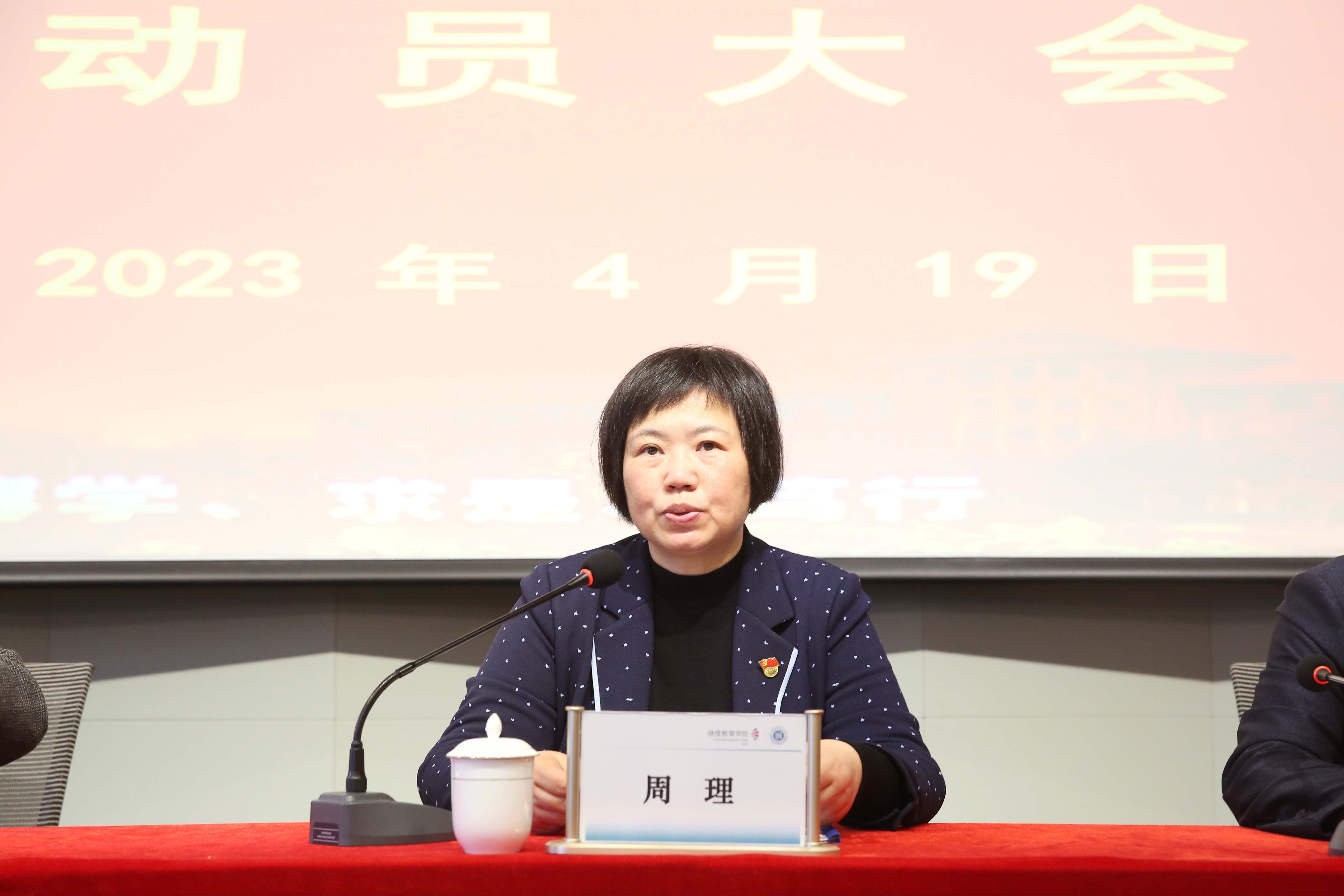 周理代表学校主题教育领导小组,对教育系统开展主题教育的重大意义、主要任务和工作要求作了进一步阐释,就认真落实各项任务提出了五点要求:一是要提高政治站位。要认真学习,深刻领会,准确把握习近平总书记的重要讲话精神,深刻认识开展主题教育的重大政治意义、理论意义和实践意义。二是要把握好“学思想、强党性、重实践、建新功”总要求。三是要坚持学思用贯通、致信行统一,把习近平新时代中国特色社会主义思想转化为坚定理想、锤炼党性和指导实践、推动工作的强大力量,使全党始终保持统一的思想、坚定的意志、协调的行动、强大的战斗力,努力在以学铸魂、以学增智、以学正风、以学促干方面取得实实在在的成效这一根本任务。四是要聚焦党对新时代党员、干部在政治、思想、作风、能力、廉洁等方面的要求这一具体目标。五是要有机贯通学和做、查和改,不断提升主题教育的质量。